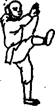 上动不停左脚落地体右转90度,抬右脚向前弹踢出双手拍击右脚面(见图333八