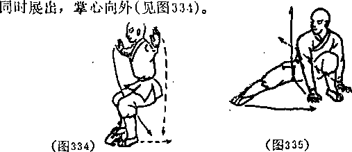 左脚后撤一步体左转90度抬右脚向侧仆地伸直成右仆步两手向胸前下按地拍打目视右侧(见图335)。