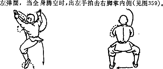 两脚向前跳一大步左脚落右脚前成左弓步两掌变拳,右拳向前冲击拳心向下左拳屈肘抱于腰侧目视右拳(见图358)。