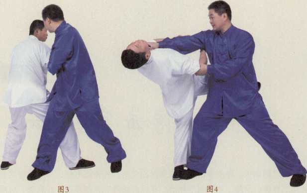 甲方(蓝衣者)以右式跃手探乙方(白衣者)之虚实乙方接手手臂僵硬(图1),甲方双手向下捋打化解乙方的瞿劲同时上前脚于乙方前腿后侧(图2),这时甲方手脚交叉向相反方向发劲以野马掌搓其咽喉之天突穴(图3-4)。现代的打法只是以虎口卡其咽喉古时镖局的武师实战时以拇食指虎口卡住对方咽喉的同时余三手指握拳以拳棱捣戳对方天突穴。天突穴在颈部胸骨上窝中央属任脉。击打后可令对方气断身亡。