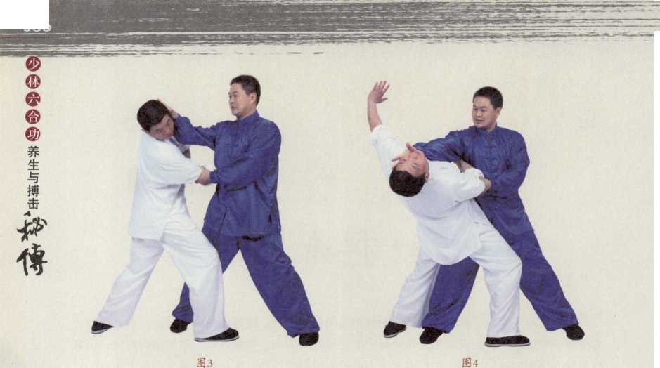 1 手挥琵琶——击太阳甲方(蓝衣者)以右式跃手探乙方(白衣者)之虚实(图1),甲方上前步以双捋手管其手肘化解乙方之硬劲(图2),同时身法旋转以右掌照乙方太阳穴处击打(图3-4)。太阳穴在颜部当眉后陷中太阳紫脉上是穴。击打此穴轻者头晕目眩重者使人毙命。要点甲方上步时左手一定要管住乙方的肘关节右手掌击打时以内螺旋劲向力裹,双手形成交叉的杠杆劲。086