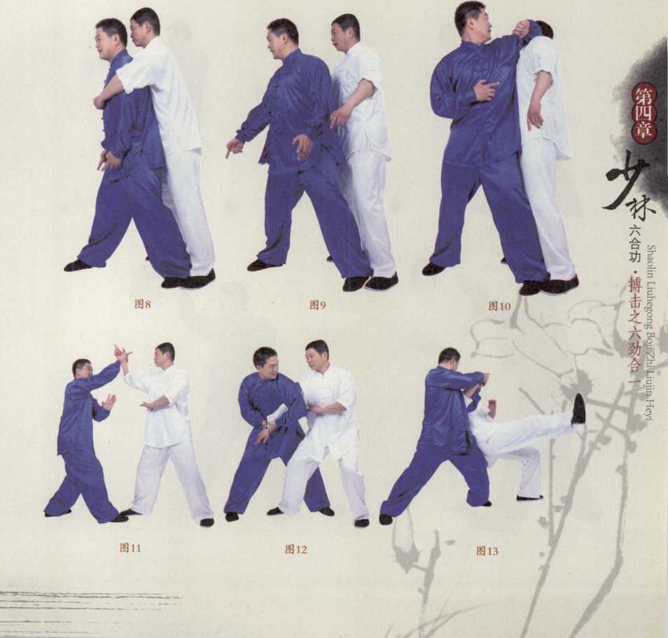 甲方(蓝衣者)以右式跃手探乙方(白衣者)之虚实(图11),甲方速上后步管住对方前腿双手捋抱乙方手腕以左肘尖靠住乙方大臂(图12),甲方身形后转以肘的摆劲将对方扔出(图13)。