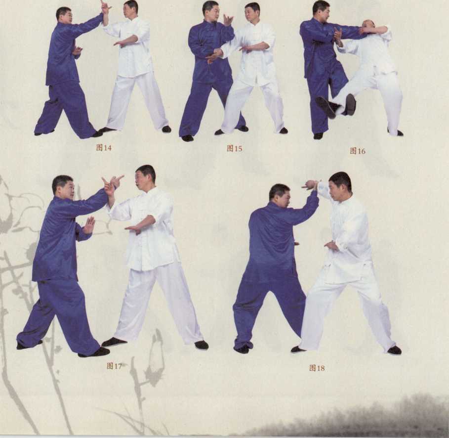 甲方(蓝衣者)以右式跃手上后脚直接攻乙方(白衣者)之下盘(图14-15),甲方攻其不备以左手横砍乙方颈部同时后脚钩踢其前腿(图16),令其倒地。
