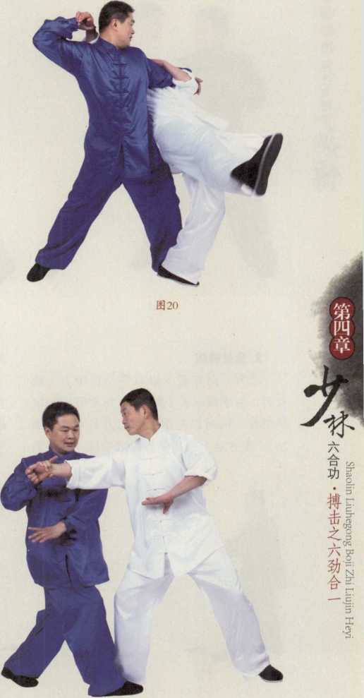 甲方(蓝衣者)跃手直接攻击乙方(白衣者)(图17),甲方以绞手式化解乙方僵劲同时上前步于乙方后侧(图18),甲身形倒转以左脚扣乙方后步与左臂形成交叉的杠杆劲(图19)。这时甲方身法抖动迅即将乙方摔出(图20)。
