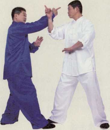 乙方(白衣者)以前插掌击甲方(蓝衣者)面部甲方观其肩动速上步以捋手封乙方肘臂(图1-2),甲方以右手反抽掌击乙方面部之太阳穴(图3)。太阳穴在颗部当眉后陷中太阳紫脉上是穴。击打此处轻者头晕目眩重者使人毙命。