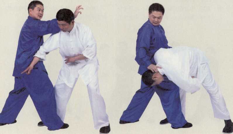 乙方(白衣者)以前抽掌击甲方(蓝衣者)面部甲方以双捋手将乙方手臂缠住(图4-5),甲方顺势以右手捋带乙方后脑之风池穴(图6)。风池穴在项部当枕骨之下凹陷处属足少阳胆经。以鹰爪手之小指与大拇指抠对方双侧风池穴令局部酸麻以此牵带其身法。