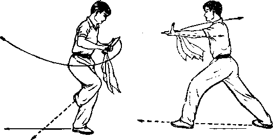 3上动不停身体继续右后转?80(面朝正西)右脚向前落步左脚再向前上一步,左腿屈膝半蹲成左弓步口与此同时,两手持刀向前推出口刀身高与肩平刀刃朝前刀尖朝左口眼看前方(图153)°