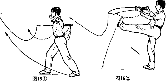 左脚向前落步(面朝西北)左腿屈膝半蹲成左弓步同时右手持刀,臂内旋屈腕使刀尖朝下才左手握住刀背一起向左上方推出口刀刃朝前刀尖朝下。眼看刀身(图17