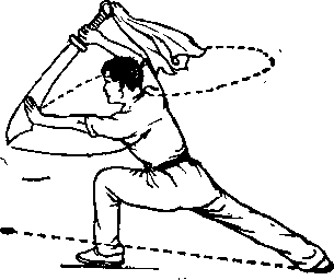 1右脚向前上一步重心前移口右手持刀与左掌分别向两侧平摆至侧举(刀刃朝右,刀尖朝前)。左掌心朝左掌指朝前。眼看前方(图161)。