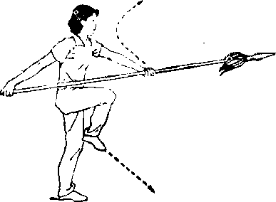 1右腿屈膝提起,身体稍向左转(面朝正东)同时右手持枪抽回平靠于右腰侧中目视枪尖(图41)