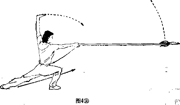 2紧接上动口右脚向前落步右腿屈膝半蹲成右弓步0同时右手持抢向前做中平扎枪,左手变掌由前向上架起掌心朝斜±0目视枪尖(图42)