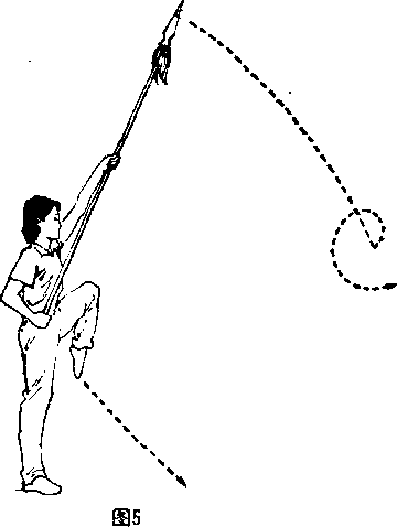 右腿挺膝直立左腿屈膝上提同时右手向后抽抢把井下压左手下摆于右手前向前滑握枪身中段并沉腕下压使枪尖上绷。目视前方(图5)