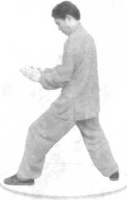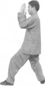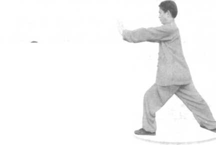 第一章 两腿进步,变成左弓桩;双掌同时向前斩出,掌心皆向 里,掌指皆向前,掌棱皆向下,位高同颈。(图3-2-137)