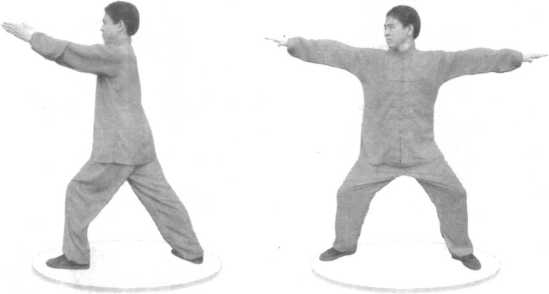 右腿前上一步,身体转正,两腿变成正蹲桩;双掌同时向左 右穿出,掌心皆向下,掌指皆向外,位高同喉。(图3-2-138)【技击含义】双掌左右穿击两方来敌咽喉。图 3-2-137图 3-2-137图 3-2-138图 3-2-138图 3-2-137图 3-2-137图 3-2-138图 3-2-13818. 立正抱掌势右脚里收,与左脚并齐,两膝伸直变成正立桩;双掌同时 收至左右胸侧,掌心皆向上,掌尖皆向前。(图3-2-139)19. 四大皆空势双掌伸臂下垂;四肢放松散劲。全套大罗汉拳结束。