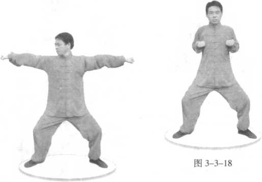 身体转正,两腿变成正蹲桩;右拳向右冲出,拳心向下, 拳面向外,臂高同肩;左拳不动。(图3-3-17 )[技击含义】冲击后方来敌。18. 罗汉蹲山势(正蹲桩双抱拳)桩型不变;双拳同时收至左右胸侧,拳心皆向上,拳面皆 向前。(图3-3-18)[技击含义】蓄劲待发。图 3-3-1719. 罗汉开炮势(正蹲桩双前冲拳)桩型不变;双拳同时向正前方冲出,拳心皆向下,拳面皆 向前,臂高皆同肩。(图3-3-19)[技击含义】双拳同时向前冲击敌方。
