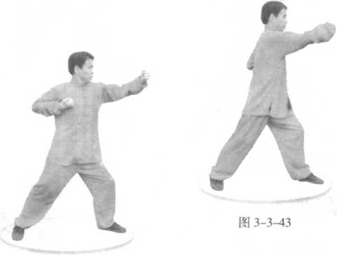桩型不变;左拳向前里灌出,位高同耳,肘节适屈,拳眼 在上,拳面向里;右拳收至右胸。(图3-3-42 )【技击含义】向里勾灌敌方耳门。2. 铁锤灌耳势(左弓桩右灌拳)桩型不变;右拳向前里灌出,位高同耳,肘节适屈,拳眼 在上,拳面向里;左拳收至左胸。(图3-3-43)【技击含义】向里勾灌敌方耳门。图 3-3-423. 罗汉开炮势(左弓桩左冲拳)桩型不变;左拳向正前方冲出,拳心向下,拳面向前,臂 高同肩;右拳收至右胸。(图3-3-44 )[技击含义】用拳向前冲击敌方要害。