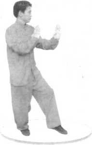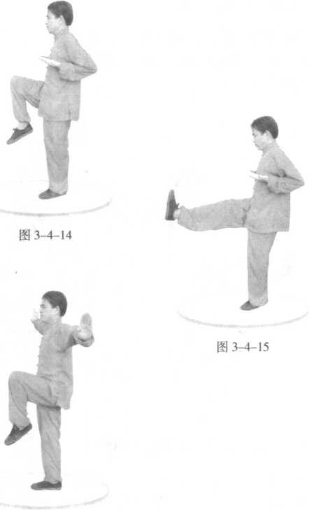 右腿向前落地,同时左腿提起,变成右独立桩;同时双掌左 右推出,掌尖皆向上,掌心皆向外,臂高皆同肩。(ffi 3-4-16)