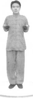 身体左转,右腿前提,与左腿并齐,成正立桩;双钩变 掌,同时收至左右胸侧,掌尖皆向前,掌心皆向上。(图 3-4-19)