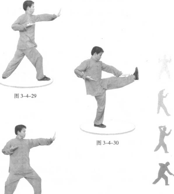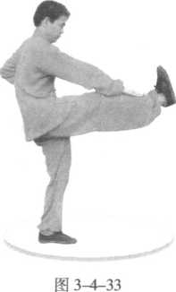 右腿向前中位正踢,膝节伸开,脚腕勾起,脚尖向上;右 掌下拍右腿;左掌协动。(图3-4-33 )