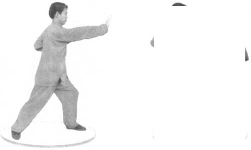 两腿变成右弓桩;左掌向前推出,掌指向上,掌心向前, 左臂位高同肩;右掌收至右胸。(图3-4-35 )