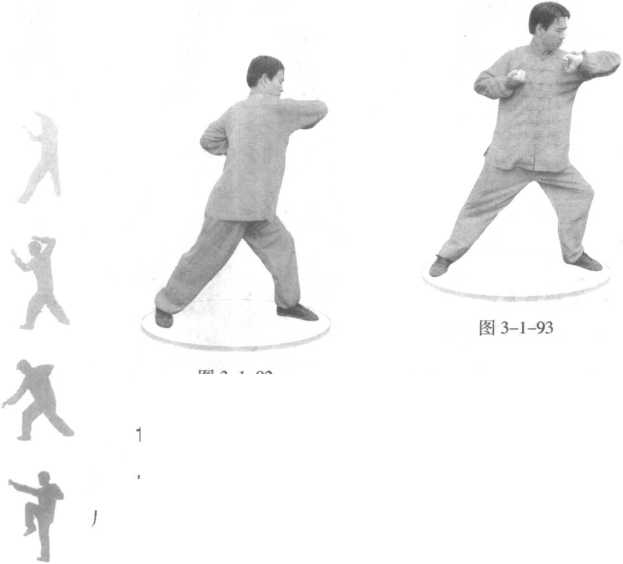 桩型不变;左肘向前里拐出,前臂向里全屈,后臂位高同 肩;右拳收至右胸。(图3-1-93 )