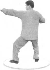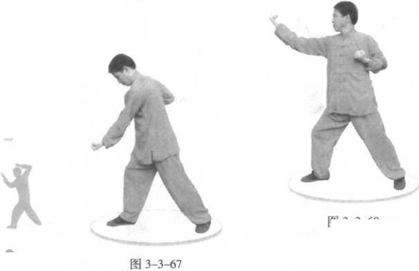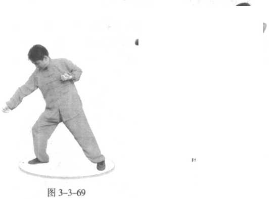 桩型不变;右拳向前下方砸出,肘节适屈,拳心向里,拳 棱向前,位高同裆;左拳不动。(图3-3-69) ?