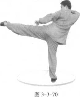 左腿向前跺出,脚腕勾起,脚尖向里,脚跟向前,位高同左腿向前跺出,脚腕勾起,脚尖向里,脚跟向前,位高同腹;双拳协动。(图3-3-70)