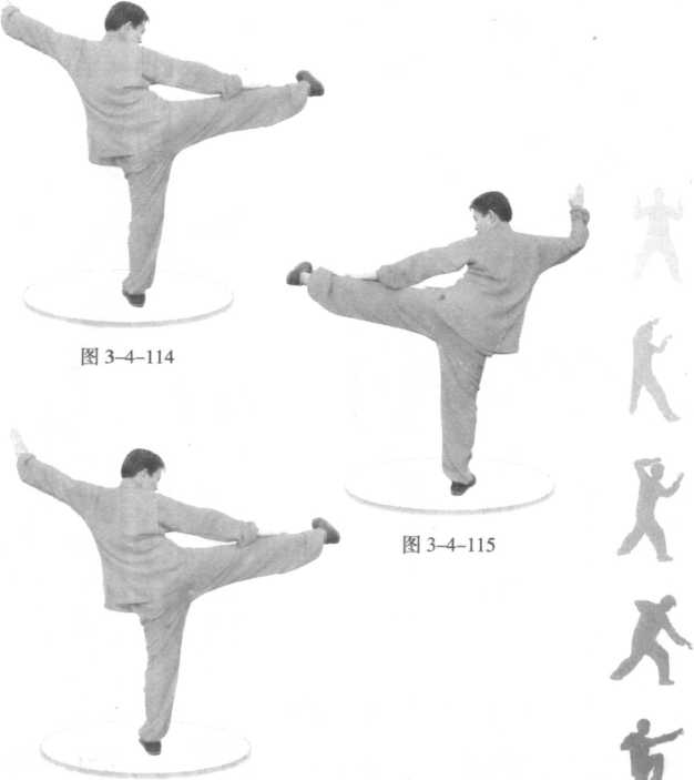 向左翻身,同时右腿向右中位侧踢,膝节伸开,脚腕勾 脚尖向里;右掌下拍右腿;左掌协动。(图3-4-114)