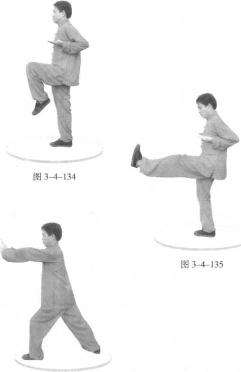 左腿上提,成独立桩;右掌收至右胸;左掌不动,双掌掌 尖皆向前,掌心皆向上。(图3-4-134)