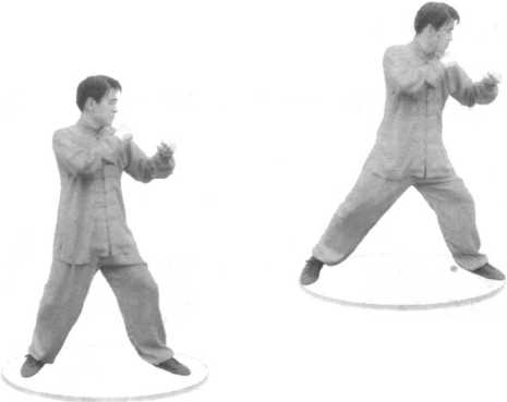 五指指端撮拢捏合,腕节里弯,俗称“钩子手”。(图2Y)图2-3 图2-4第二节步法妙兴大师说:“罗汉法门以步为先。”步法的运用在技击 实战中占有极其重要的地位,其好坏直接关系到用招的成败。 从进攻讲,再猛的力量,再妙的招势,步身不到,空放一炮, 何用之有。从防守讲,可以起到卸化、削弱、浪费敌强大劲力 并转变战势的极大作用。进步指前腿先动,带动后腿,速度较快,步幅较小,非常 稳当。(图2-5、图2-6)