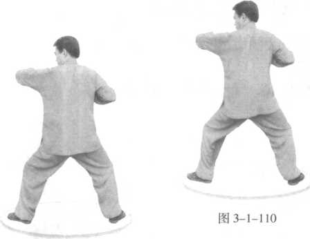 两腿再进,桩型不变;左肘再次向前捣出,前臂向里全 屈,后臂位高同肩;右拳不动。(图3-1-110)