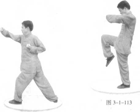 右膝向上顶出,位高同腹,小腿全屈,脚尖下垂;双拳协 动。(图 3-1-113)