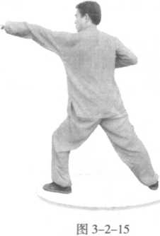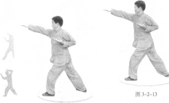 [技击含义】穿击敌方咽喉。[技击含义】穿击敌方咽喉。两腿同时向前进步,桩型仍然不变;右掌一收即发,再次 向前穿出,掌心向下,掌指向前,位高同喉;左掌不动。(图 3-2-13 )