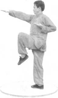 左腿提起,两腿变成右独立桩;右掌一收即发,再次向前穿 jF 出,掌心向下,掌指向前,位高同喉;左掌不动。(图3-2-14) [技击含义】连续不断地穿击敌方咽喉。