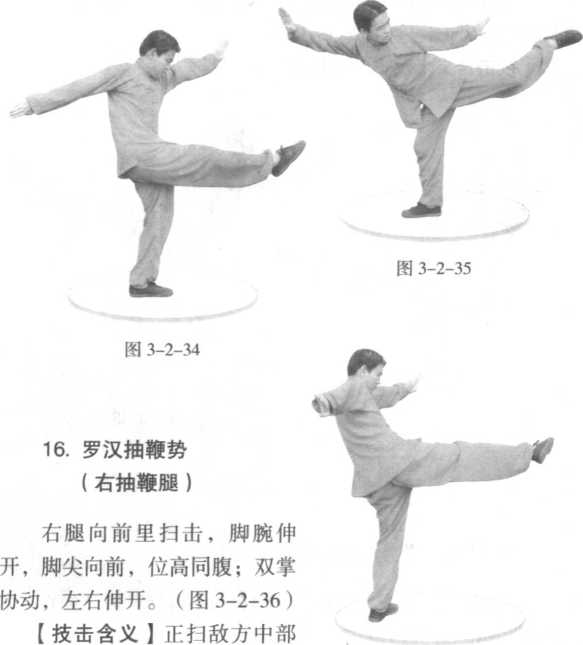 左腿向前外反扫,脚腕伸开,脚尖向前,脚跟向外,位高 同腹;双掌协动,左右伸开。(图3-2-35 )要害。 图3-2-36要害。 图3-2-36[技击含义】反扫敌方中部要害。要害。 图3-2-36要害。 图3-2-36