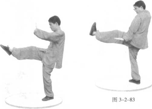 右腿向前弹出,脚面在上,脚尖向前,位高同腹;双掌协 动。(图 3-2-82)[技击含义】正弹敌方中部要害。2. 罗汉蹬山势(左蹬腿)左腿向前蹬出,脚腕勾起,脚尖向上,脚跟向前,位高同 腹;双掌协动。(图3-2-83 )【技击含义】蹬击敌方中部要害。图 3-2-823. 罗汉蹬山势(右蹬腿)右腿向前蹬出,脚腕勾起,脚尖向上,脚跟向前,位高同 腹;双掌协动。(图3-2-84 )[技击含义】蹬击敌方中部要害。