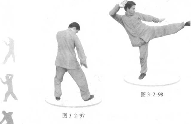 左腿向前跺出,脚腕勾起,脚尖向里,脚跟向前,位高同 腹;双掌协动。(图3-2-98 )
