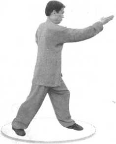 (2) 右掌向前里砍击,掌形 稍斜,掌心斜上,掌背斜下,拳 棱向里,位高同颈。(图1-48)