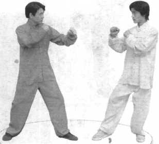 2. 抽鞭腿从前发腿,甩鞭腿向后倒踢。连环使用,一是 正好顺势,蓄发便利;二是一腿走空,另一腿补救,不给敌喘 息之机;三是控制面极大,敌左右两翼皆在我腿击范围之中; 四是震荡力极强,能把敌方踢得左摇右晃,重则可立倒。