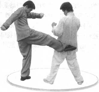 (2) (图 7-98)(图 7-98)我见机急进,先发右势抽鞭腿,踢敌身体。