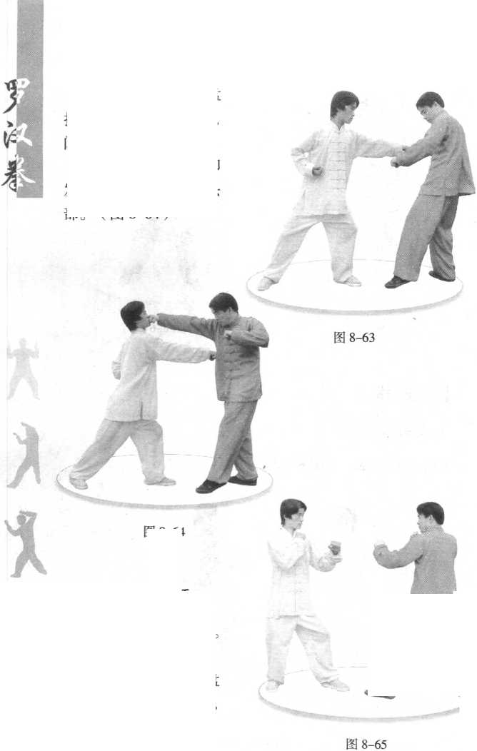 (2) 敌先向我中盘 打来,我急向后吞身, 闪避来招。(图8-63)