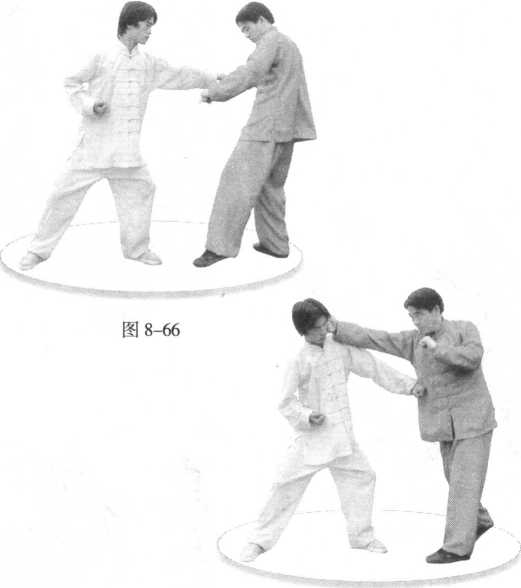 (2) 敌先向我中盘 打来,我急向后吞身, 闪避来招。(图8-66)