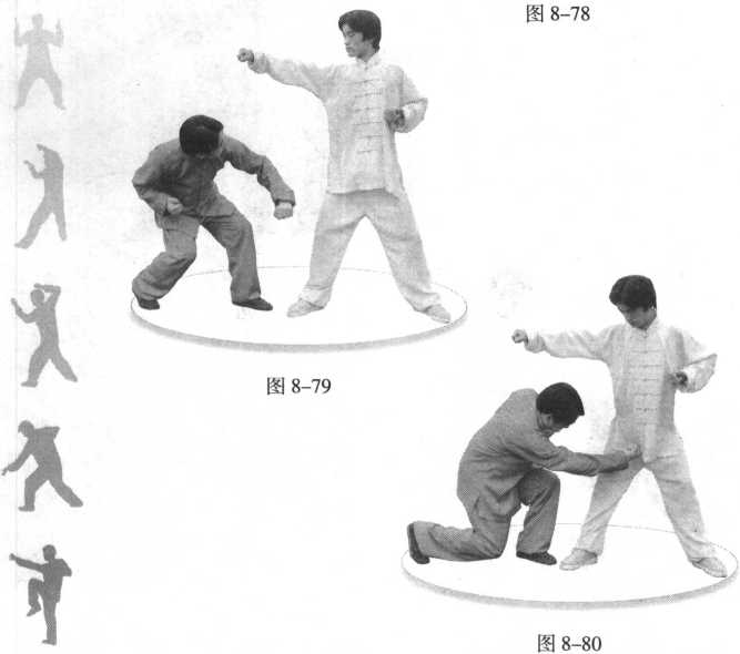 左门对敌。(图 8-78)(1) 敌先向我上盘 打来,我急向下蹲身, 闪避来招。(图8-79)(2) 快速反击,即 发右势撩阴锤,掏打敌 裆部。(图8-80)【要点解析】1. 此招专破上位猛劲。见敌势猛,则原地下势,蹲身避 之,后即用拳速击敌下部,主打裆部,中则重伤。2. 此招的闪避不动步幅,只用桩法和身法,动形较小, 反击必快。但对位要准,距离要调整得当,因潜身矮桩,不易 连变,必须力求一击必伤。