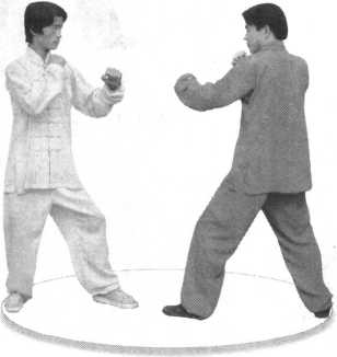 [招法单练】1. 炮脸法(1 )左门预 备。(图1-8)(2)右拳向前 冲击,拳心向下, 拳眼向左,拳面向 前,位高同脸。 (图 1-9)2. 炮耳法(1 )左门预备。(2)右拳向前冲击,拳心向下,拳眼向左,拳面向前,位 高同耳。(图1-10)[实战举例】1. 炮脸法(1) 左门对 敌。(图 1-11)(2) 我见机 急进,用右拳猛 力冲击敌脸门。 (图 1-12)