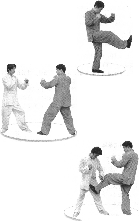 3. 此腿出形的特别,一要注意发腿的力度,要常练以能 踢出杀伤力,为了加力,要用后腿踢;二要对位,以裆部为主 为重,此处能产生高效。其本身优点:一是出人意料,如果是 前腿撩阴,更具突然性;二是动形小,不易被敌捕获。