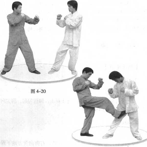 (2) 我见机左腿速 出,猛力撩踢敌裆部。 (图 4-19)