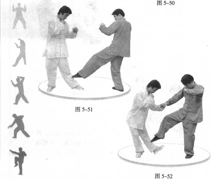 (2) 我见机急进, 先发左势尖子腿,踢敌 胫骨。(图5-51)