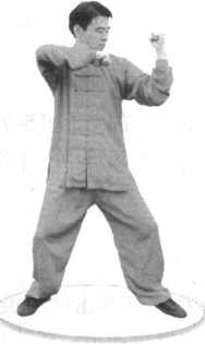 [招法单练】1. 里顿错锤法(1 )左门预备。(2) 左臂向里搬拦。(图5-76)(3) 连动不停。左臂顺势展开,打出左手当头箭,位高同 头。(图 5-77)图 5-76图 5-76图 5-77图 5-77图 5-76图 5-76图 5-77图 5-77