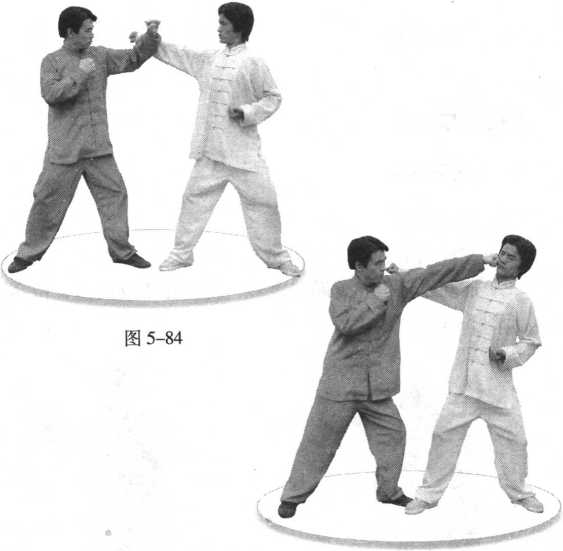 (1)左门对敌。(图 5-83)(1)左门对敌。(图 5-83)图 5-82图 5-82(2) 图 5-85图 5-85敌先出拳攻我中、上部,我急用左势外提拦法,挡开 敌招。(图5-84)图 5-85图 5-85(3) 快速反击,疾发左手当头箭,打敌头部。(图5-85 )【要点解析】1. 此招先用拦法,格挡敌来劲,顺势单节反击,连消带 打,即拦即打,干脆利索,省时高效,便捷易用。2. 从劲力上讲,拦防屈臂是锤之蓄力,既破了来招,又 蓄满力量,招之绝妙即在此。