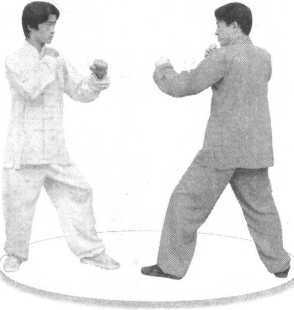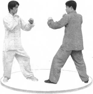 1-此招是初战时常用的技法。一旦与敌对峙,双方战架 肃立,防范森严,我欲伤敌,必先破门。要把敌防御手臂扒